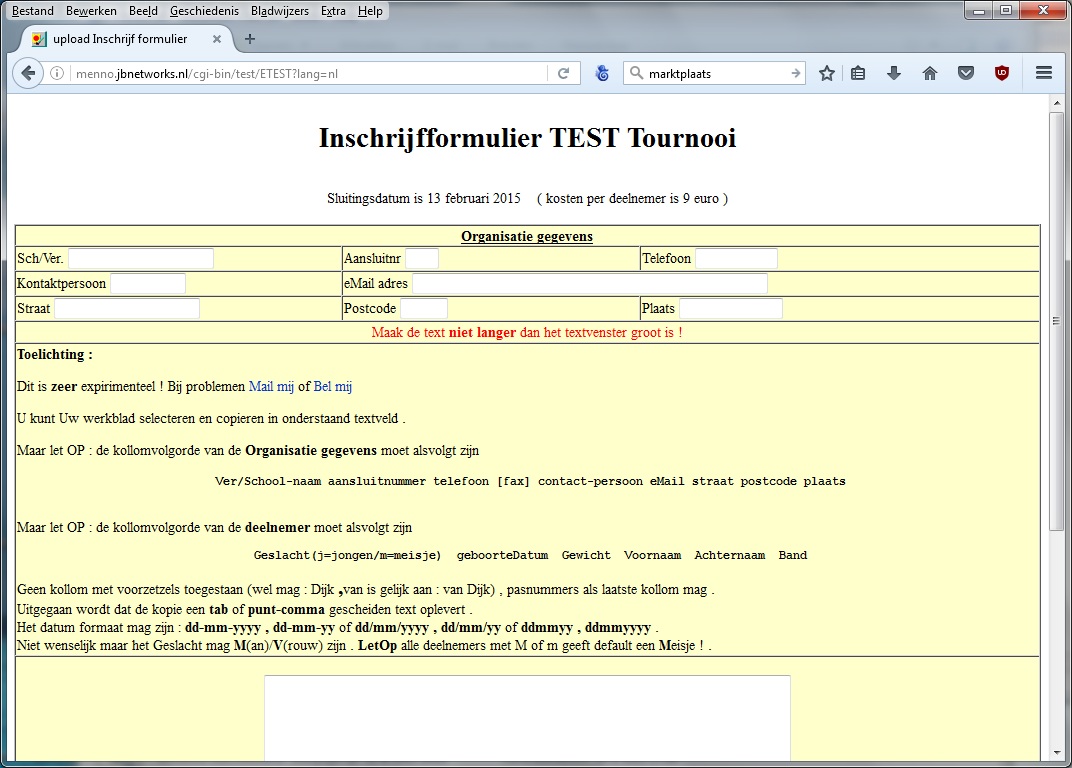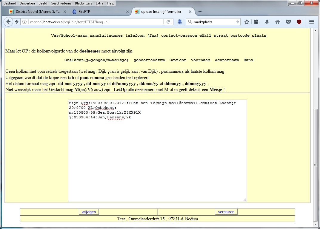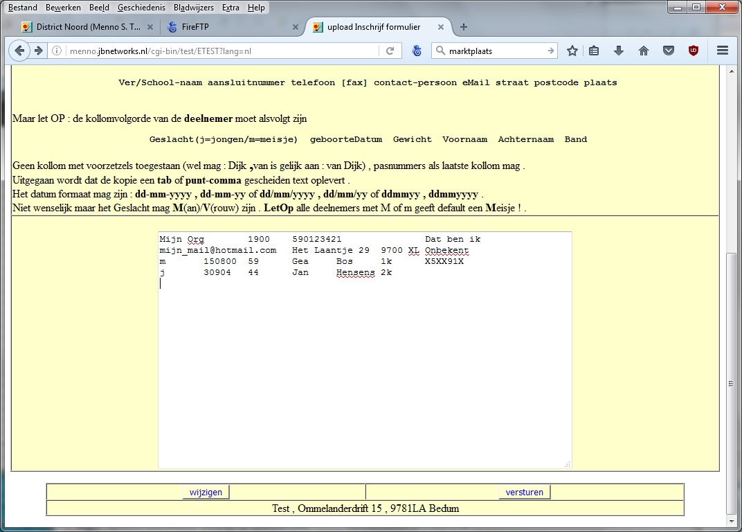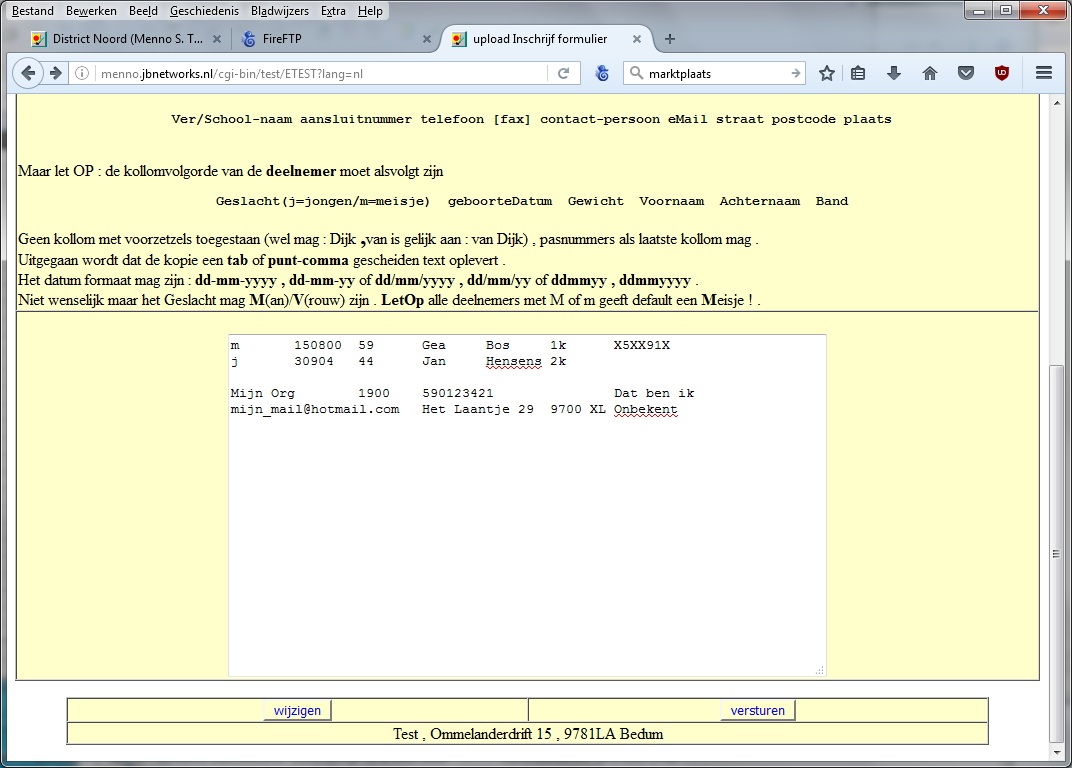 Als alles goed is kun je met de knop "versturen" je inschrijving versturen en dien je een mail ter bevesteging terug te krijgen .